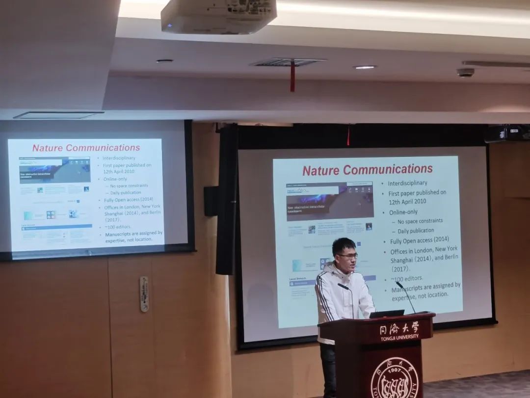 Nature Communications高级编辑诸佳俊博士首先向大家介绍了Nature系列期刊,从题材、内容、编辑等方面讲述Nature、Nature研究型子刊、Nature Communications对文章要求的异同,并重点解析了Nature及其旗下刊物的构架、视野与目标内容以及例文。讲座使得听众对Nature系列刊物的定位与偏好有了具体认识,便于找到契合自己研究方向的目标期刊。接着诸佳俊编辑还详细介绍了编辑预审的流程和不同阶段编辑的判断依据,深入讲解了论文撰写技巧、论文投稿注意事项(投稿信设计、审稿流程剖析、审稿意见回复)和投稿后事宜(稿件接收后事宜、拒稿后申诉)等。