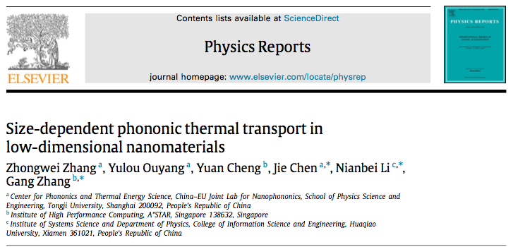 博士生张忠卫(第一作者)、陈杰教授(共同通讯作者)与华侨大学李念北教授(共同通讯作者)以及新加坡高性能计算研究所张刚教授(共同通讯作者)合作在物理类顶级期刊《Physics Reports》发表了题为“Size-dependent phononic thermal transport in low-dimensional nanomaterials”的综述论文,系统地总结了低维纳米材料热传导领域的最新研究进展,集中介绍了其独特的尺寸效应。论文从一维纳米材料出发,从理论模型、计算模拟以及实验测量等多个方面详细介绍了尺寸依赖热传导的独特现象及其物理根源,并介绍了相应的严格理论证明。此外,论文还全面归纳了二维材料中的尺寸依赖热输运特性,以及在界面热传导和热整流方面的效应。最后,论文指出了低维纳米材料热输运研究领域的主要挑战,并提供了一些解决当前问题的可行方案,为未来该领域的研究指明了方向。