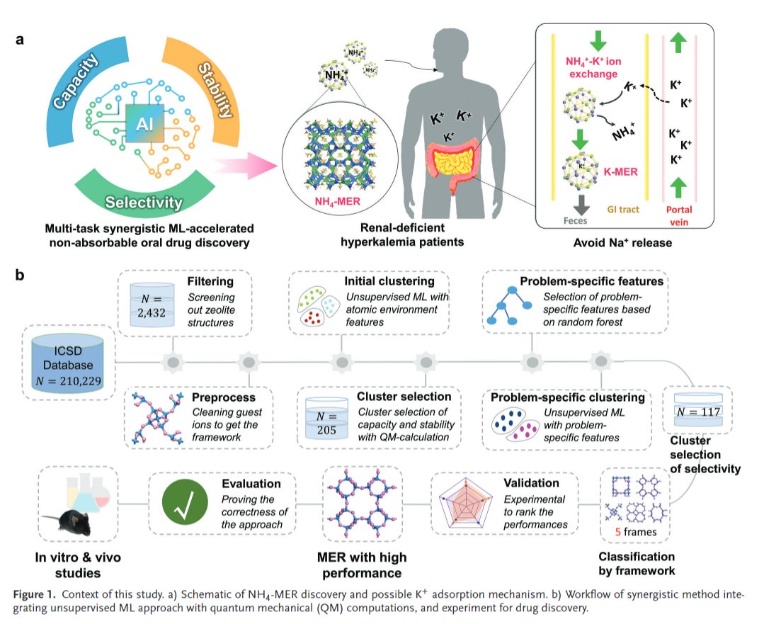 在慢性肾脏病领域,高钾血症具有未被满足的临床需求。纳米多孔材料由于其不可吸收性质,在作为非口服性药物方面有巨大的应用潜力。因为多孔材料具有丰富的多孔结构,可以通过相互作用吸收人体消化道中不需要的客体分子/离子,这在治疗一系列慢性疾病方面有很大的前景。然而传统药物发现的方法,既耗时又成本高昂。而且,对复杂的纳米多孔材料进行大规模的量子物理材料计算,或进行高通量湿实验筛选,均会产生相当大的成本。因此,如何高效地低成本地寻找符合目标功能的纳米多孔晶体材料成为一个艰巨的挑战。作者们创新性地设计了一种协同机器学习方法,结合精心设计的多孔材料的几何拓扑描述符,将少数据驱动的多层次的无监督学习,基于量子物理的材料密度泛函计算,和最小化的动物生化湿实验相结合,成功解决了上述问题。