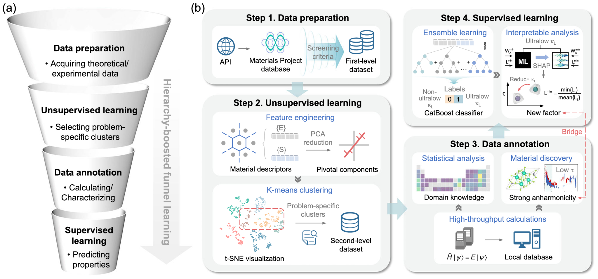 图1 用于加速功能材料发现的层次增强漏斗学习(HiBoFL)框架:(a)HiBoFL框架的示意图,包括数据准备、无监督学习、数据标注和有监督学习;(b)将HiBoFL框架应用于高效识别具有超低声子热导率半导体的工作流程。