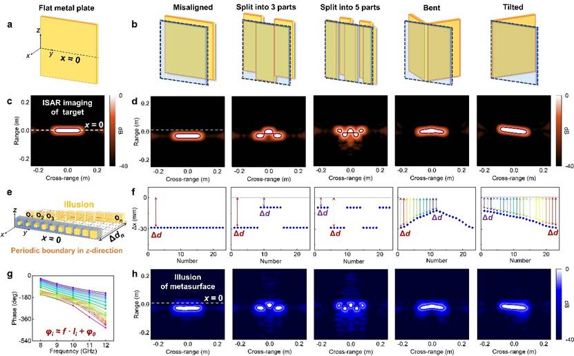 通过收集8至12GHz的宽带以及-30°至30°的宽角范围内经设计超表面调制后的散射场信息并进行成像处理,可在散射成像中观察到多种设计的幻像效果,包括目标的错位、分段、弯曲和倾斜等。这一研究将幻像研究的工作带宽和角度范围进行了扩展,从设计方法和实现效果上进一步拓宽了幻像研究的广度和深度,为相关领域的应用和发展提供了新思路和方向。