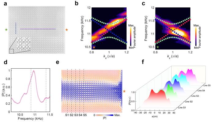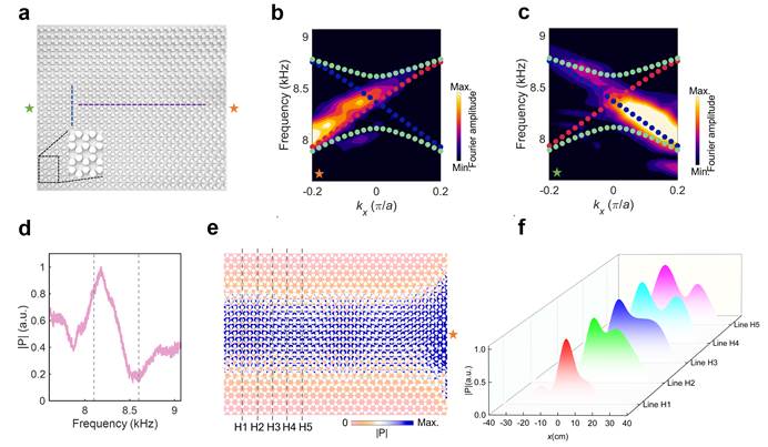 最后,研究团队通过3D打印技术制造了所设计的结构(图4a,图5a),实验表征了自旋锁定的零阶声学朗道能级的色散曲线(图4bc,图5bc),并进一步展示了基于零阶声学朗道能级的大面积声波调控特性(图4def,图5def)。所设计的结构可应用于开发具有鲁棒性的大面积声波调控元器件。同时,所提出的智能设计方法可以扩展到弹性波及电磁波系统,从而在不同对称性晶格中定制自旋锁定的弹性及电磁朗道能级。