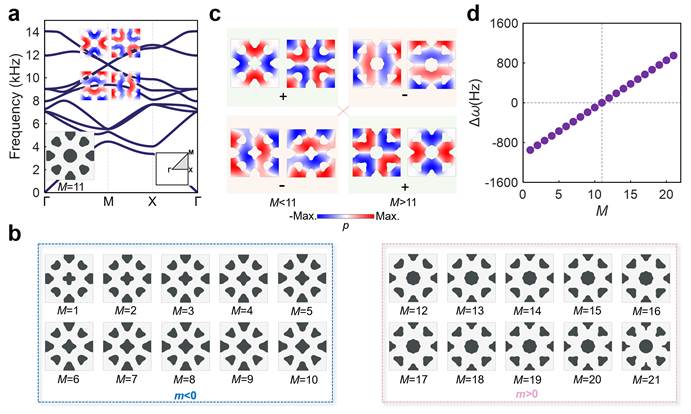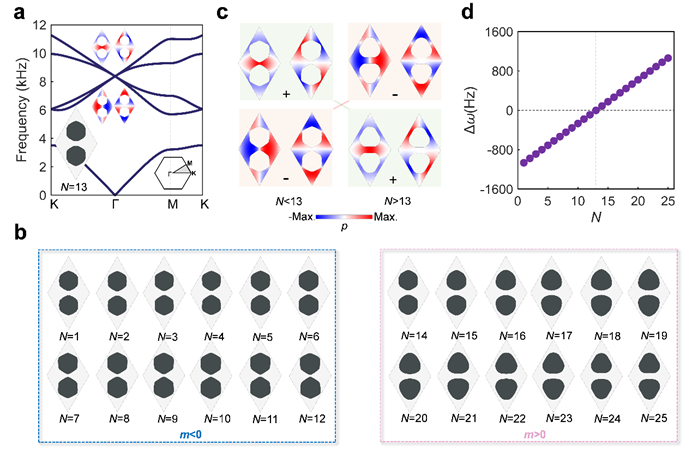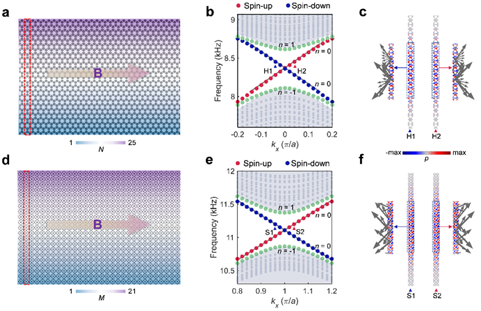 朗道能级是由苏联科学家列夫·朗道提出的带电子粒子在均匀磁场中运动时局域在不同轨道上的现象。在声学系统中,可以通过人工合成赝磁场,实现声学朗道能级,从而实现声波局域化调控。然而,在声子自旋系统中(尤其基于方形晶格)构建人工合成赝磁场极其困难。研究团队采用拓扑优化技术同时在六角晶格(图1)及方形晶格(图2)中构建了由两个偶极模态和四极模态简并的双狄拉克锥,并进一步打破该双狄拉克锥,定制了局部带隙呈梯度变化的单胞构型,从而实现了单胞狄拉克质量的线性变化。随后,将所设计单胞沿竖直方向排列并沿水平方向周期阵列后,成功合成了面内赝磁场(图3a,d)。在该磁场的诱导下,形成了自旋向上和自旋向下的两条声学朗道能级(图3b,e)。