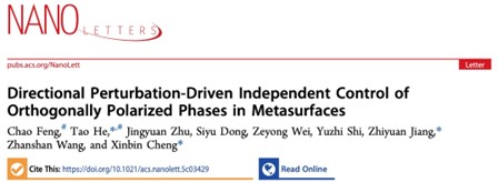 程鑫彬教授和王占山教授联合中国计量科学研究院的蒋志远副研究员提出了一种基于定向微扰超构表面的正交线偏振相位完全解耦新机制。相关研究成果以“Directional Perturbation-Driven Independent Control of Orthogonally Polarized Phases in Metasurfaces”为题发表于《纳米快报》(Nano Letters),并入选期刊封面(Supplementary Journal Cover)。