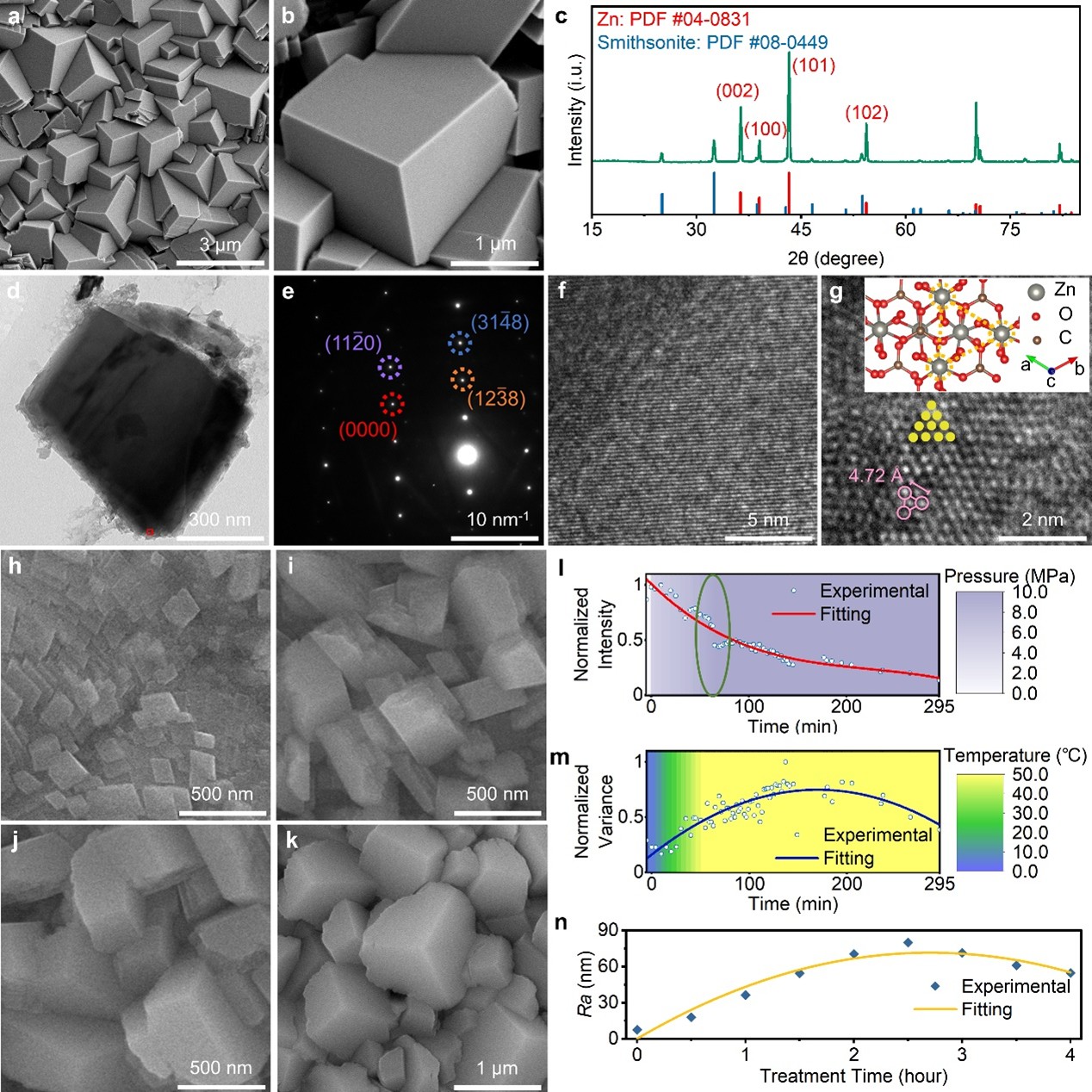 风光等新能源发电存在波动性,大规模储能是其并网的关键,水系锌离子电池因稳定性好、安全性高、成本低是理想的规模化使用的储能器件。然而,锌离子电池规模化使用还面临着锌沉积过程中普枝晶生长与副反应腐蚀问题,严重影响电池的可逆性与循环寿命。研究团队受自然界矿化作用启发,利用含水的超临界CO2流体体系实现界面自生成矿,在锌表面生成低导电性、耐腐蚀且力学稳定的ZnCO3晶态保护层。该无机涂层不仅抑制了界面副反应,还通过晶格匹配诱导锌离子在其表面进行择优取向的外延沉积。