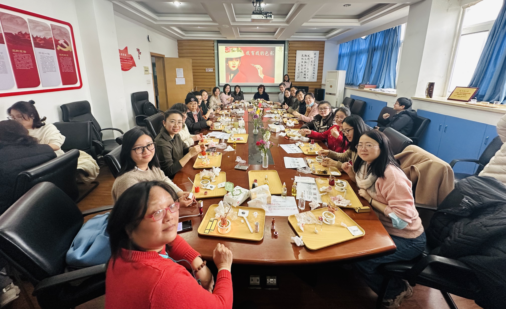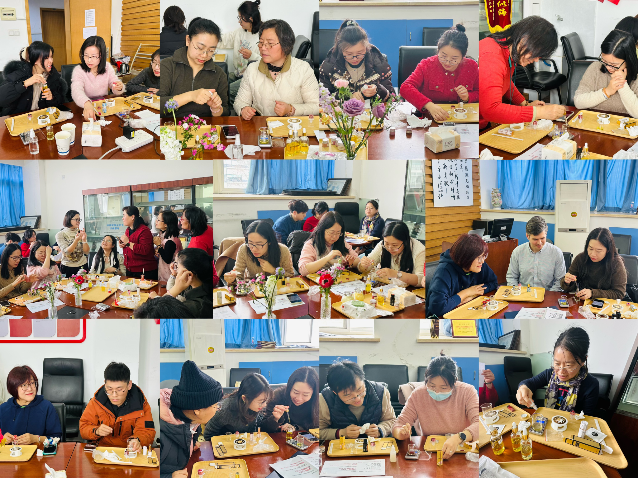 随后是精油口红DIY环节,40余名教师制作了专属口红。活动以健康环保的方式传递节日祝福,致敬女性魅力。本次活动在专业导师指导下,教师们可自由调配色号、定制专属配方,打造独一无二的天然口红。消毒、称量、搅拌、加热融化、入模凝固,整个活动更像是一节物理实验课,活动现场气氛热烈。通过活动特别营造男女教师共同参与的氛围,女教师可通过DIY过程探索自我风格,感受色彩赋予的自信与表达;男教师则可亲手制作心意礼物,为爱人、母亲或女性友人献上一份兼具创意与温度的惊喜。