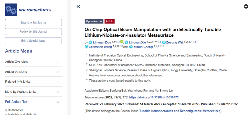 2018级物理学试验基地班本科生豆淋源以第一作者身份在Micromachines杂志上发表“基于绝缘体上铌酸锂的片上电可调波束调控超表面”(“On-Chip Optical Beam Manipulation with an Electrically Tunable Lithium-Niobate-on-Insulator Metasurface”)论文,Micromachines 期刊被Scopus、SCIE (Web of Science)和PubMed等众多数据库收录,主要聚焦微纳结构、设备和系统、应用物理方向的科学和技术。豆淋源于2021年8月进入程鑫彬教授和王占山教授课题组学习,在魏泽勇副教授的指导下学会了微纳光学基础理论、数值仿真方法,并提出了一种绝缘体上铌酸锂(LNOI)上的超表面,借助该超表面可在LNOI片上实现电可调谐的聚焦、偏折等波束调控功能。论文通讯作者为1024社区
