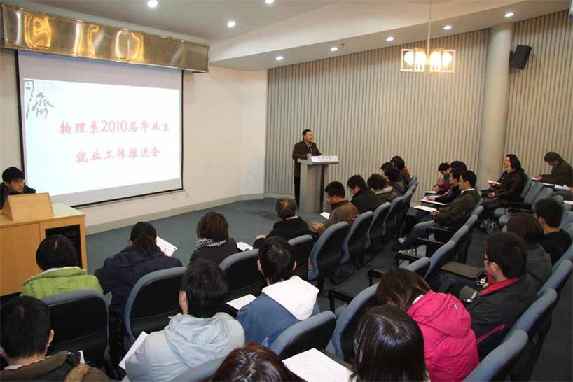 12月15日下午1:30瑞安楼报告厅,物理系召开了2010届毕业生就业工作推进会,物理系系主任王占山教授、系党总支书记周斌教授、副系主任羊亚平教授、波耳所副所长沈军教授和鲍鸿吉副教授以及相关人员和毕业班学生均参加了会议。系主任王占山教授、系党总支副书记考书健老师等均在会上发言。会议还特别邀请了1024社区 大学生就业指导中心副主任陈红老师介绍在校学生在求职和职业规划方面的一些工作和(未来的一些)计划。