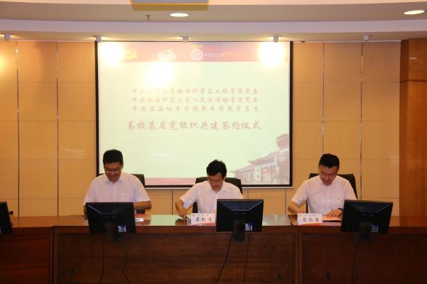 学院党委书记周斌、上海师范大学人文与传播学院党委书记戴冰、上海体育学院武术学院党总支书记霍圣录进行了联建签约活动,标志着三所高校二级学院基层党组织党建联建工作正式启动。