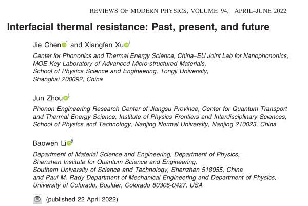 北京时间2022年4月22日,《现代物理评论》(Reviews of Modern Physics)在线发表题为“Interfacial Thermal Resistance: Past, Present and