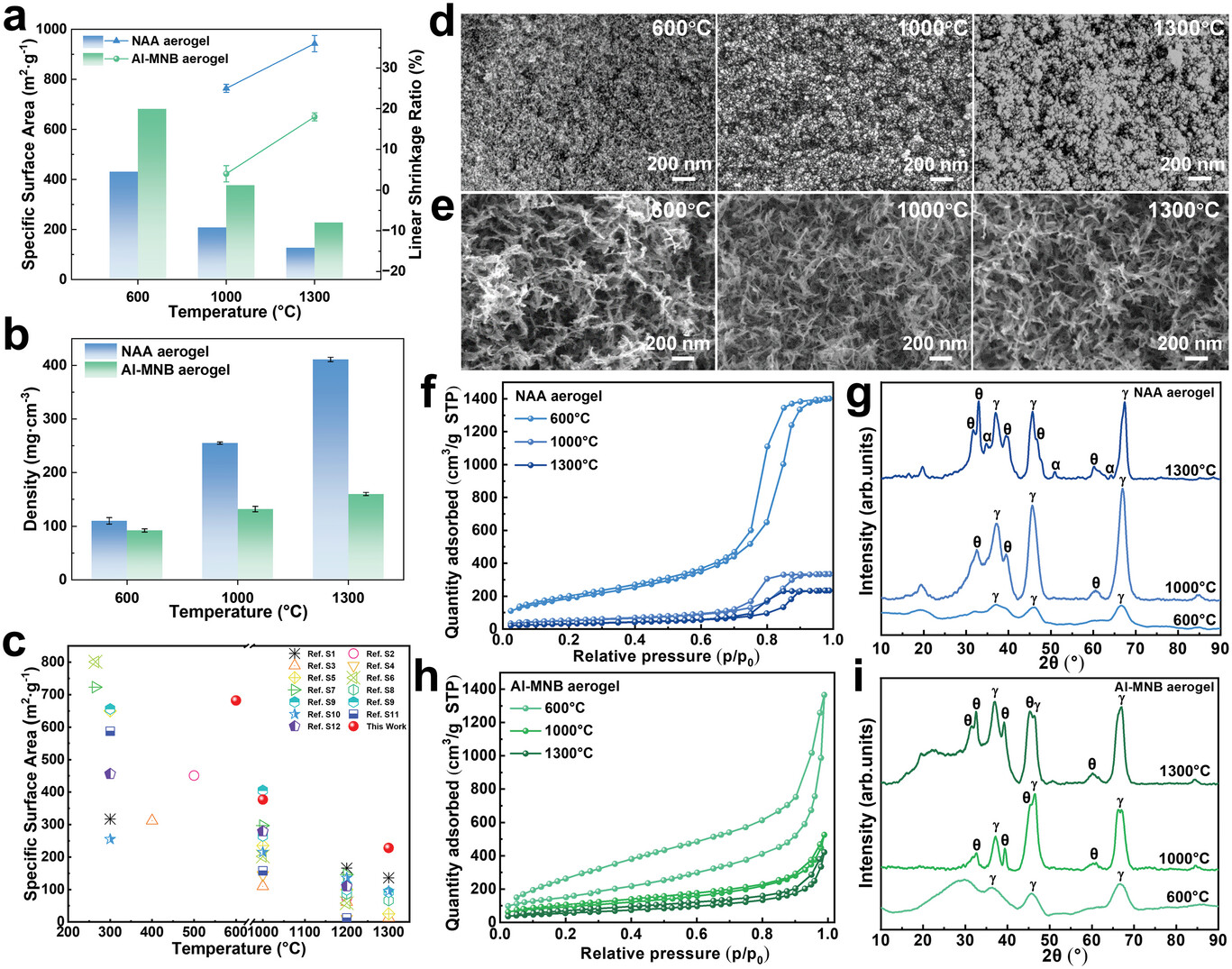 这种一维纳米带基元结构的构筑,避免了纳米颗粒组装的基元结构中的颗粒间节点的形成,减少了应力集中点的同时抑制了高温下的传质和相变,MNB气凝胶因此表现出优异的力学性能和耐高温性能。Al-MNB气凝胶能够承受高达80%的压缩而不碎裂,而传统纳米颗粒组装的氧化铝气凝胶仅能承受4%的压缩。此外,Al-MNB气凝胶在高温实验中表现出优异的耐火性和高温隔热性能,1300°C热处理2小时后仍能保持228m2/g的高比表面积,丁烷喷枪火焰灼烧300s后平均背温仅为68.6°C。