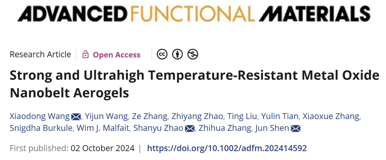 王晓栋副教授和沈军教授团队联合瑞士联邦材料科学与技术研究所(EMPA)赵善宇研究员,通过聚合物微模板法,调控了金属氧化物气凝胶的纳米基元结构,大大提升了其力学性能和耐高温性能,有望使气凝胶在航天飞行器和动力电池领域的应用再上一个台阶。相关研究成果以“Strong and Ultrahigh Temperature-Resistant Metal Oxide Nanobelt Aerogels”为题在线发表于国际知名期刊《先进功能材料》(Advanced Functional Materials)。