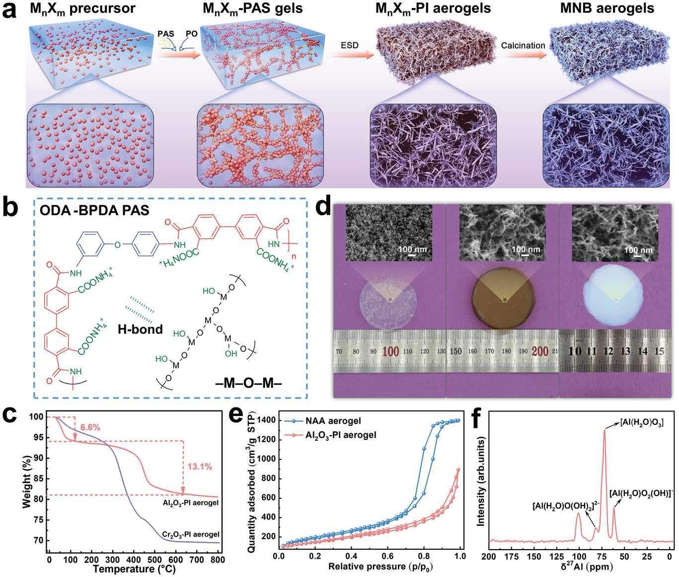 受聚合物气凝胶优异力学性能的启发,本工作采用聚合物微模板化策略,通过聚酰氨酸盐和金属盐前驱体的共凝胶反应,将纳米颗粒组装的项链状基元结构转变为类聚合物状的纳米带结构,经超临界干燥和煅烧去模板,获得了Al2O3、Cr2O3和Fe2O3等金属氧化物纳米带(MNB)气凝胶。聚酰胺酸盐分子链和溶剂化金属离子之间的氢键相互作用,使得金属氧化物的初级胶体粒子缠绕聚酰胺酸分子链生长,最终以一维纳米带形式排列。经乙醇超临界干燥和600°C煅烧去模板后,纳米带结构仍然完好无损。这一稳定的微结构也说明MNB气凝胶具备高温服役的潜质。