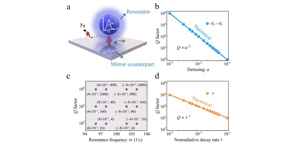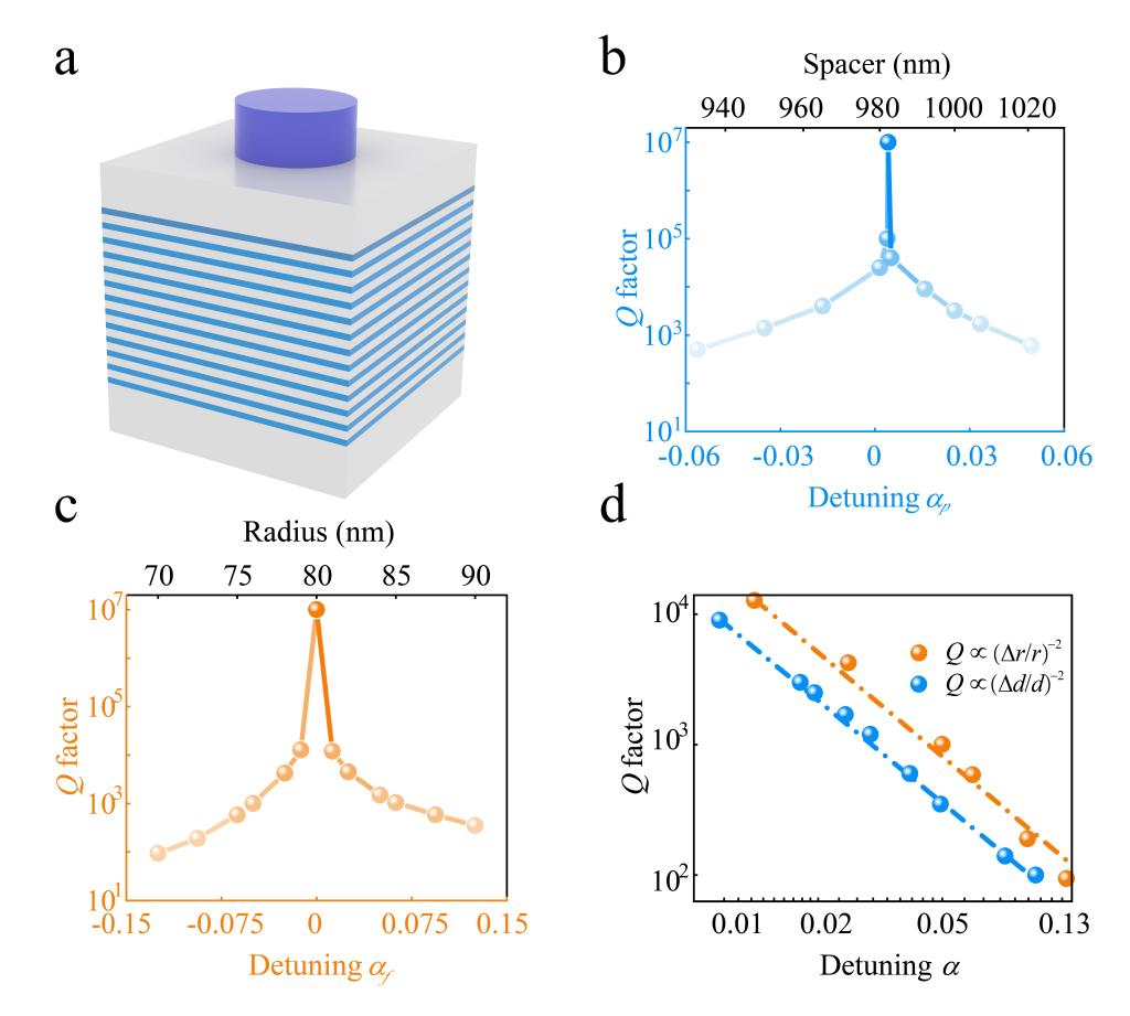 王占山和程鑫彬团队联合中国计量科学研究院屈继峰研究员,提出了一种层间耦合谐振子模型(图1a),从理论上严格推导了FP-BICs在微扰作用下的Q因子的演化规律,揭示了Q因子与相位失谐和频率失谐的平方成反比(图1b),同时又和非辐射衰减率成反比的理论规律(图1d),从而实现了FP-BICs谐振的定向工程(图1c)。进一步地,通过引入由超表面和多层膜组成的多层膜超表面,诱导产生了FP-BICs(图2a)并验证了理论的准确性。这种构型依赖于由超表面实现的光学谐振器与由多层膜实现的完美镜像对应物之间的耦合,通过改变间隔层模拟相位失谐(图2b),改变超表面单元半径模拟频率失谐(图2c),最终拟合结果表现出了与理论结果良好的一致性(图2d)。